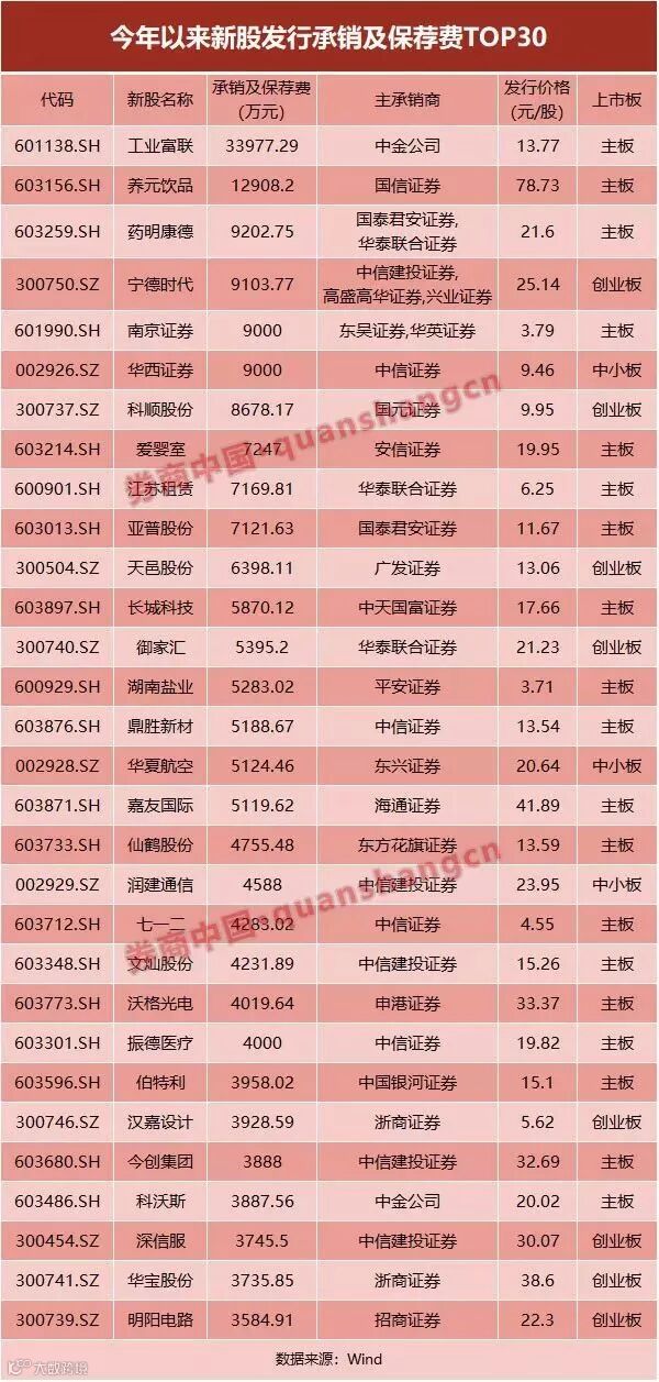 从IPO项目来看,从药明康德、宁德时代、富士康,到已向港交所提交招股说明书的小米公司,再至CDR,这些大块头项目基本上全部归大投行所有。今年以来新股发行承销及保荐费TOP30中,IPO承销及保荐费用支出排名靠前的新股,其保荐机构也集中在行业排名前十的头部券商。