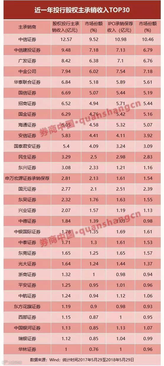从近一年来的股权融资项目主承销收入排名来看,中信证券和中信建投证券位居行业前两位,市场份额分别为9.52%、7.18%。近一年股权融资项目主承销收入排名前十的券商中,中金公司首发IPO承销保荐费占比最高,达95%。今年凭借富士康一单IPO项目,中金公司独揽3.4亿元承销及保荐费。