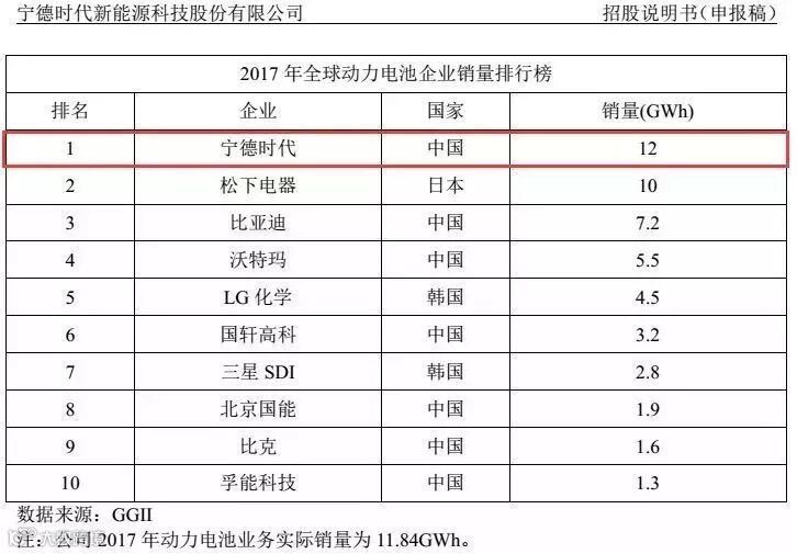 宁德时代招股书显示,公司2017年动力电池的销量为11.84GWh,在全球排名第一,排名第二和第三的分别是松下和比亚迪,韩国知名企业LG化学和三星SDI分别位居第五位和第七位。