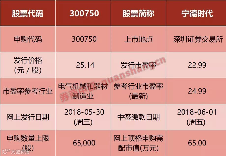 具体来看,宁德时代申购日为明日(周三),申购代码为300750,顶格申购需配深市市值65万元。