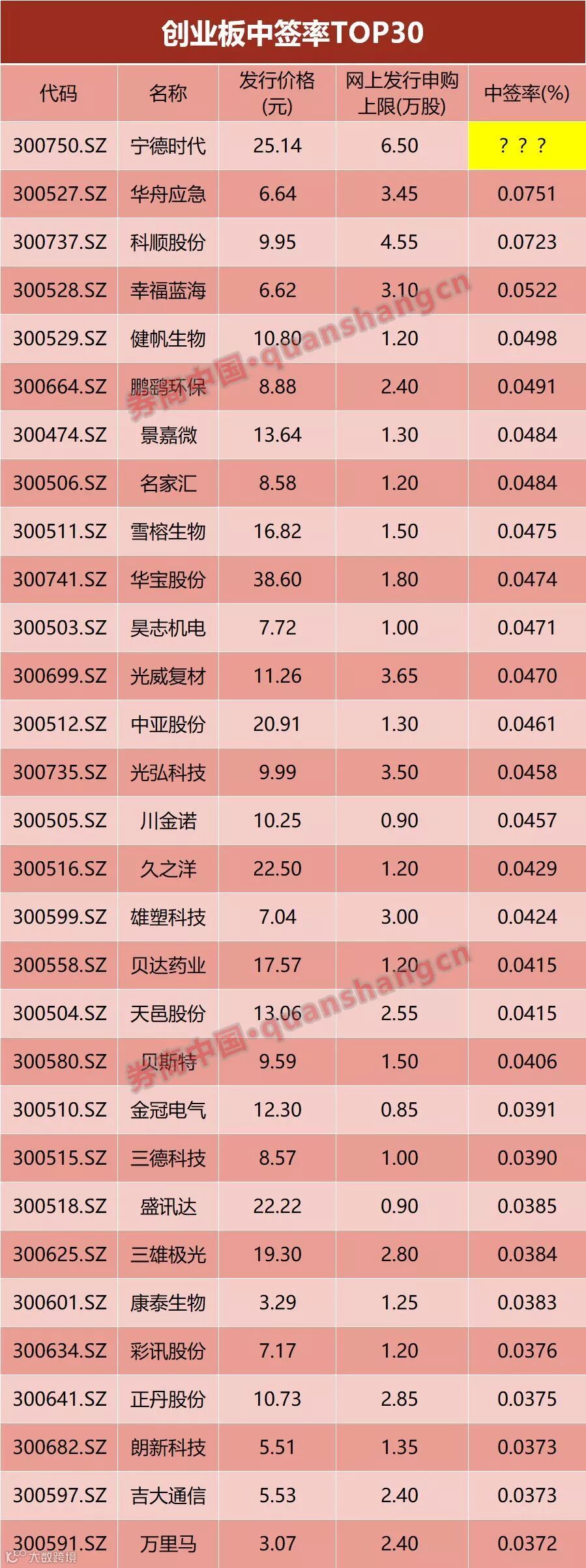 值得注意的是,从网上申购上限来看,宁德时代上限为6.5万股,为2016年以来最大值。鉴于新股中签率与新股网上发行申购上限成正相关,宁德时代有望成为创业板中签率最高的新股。