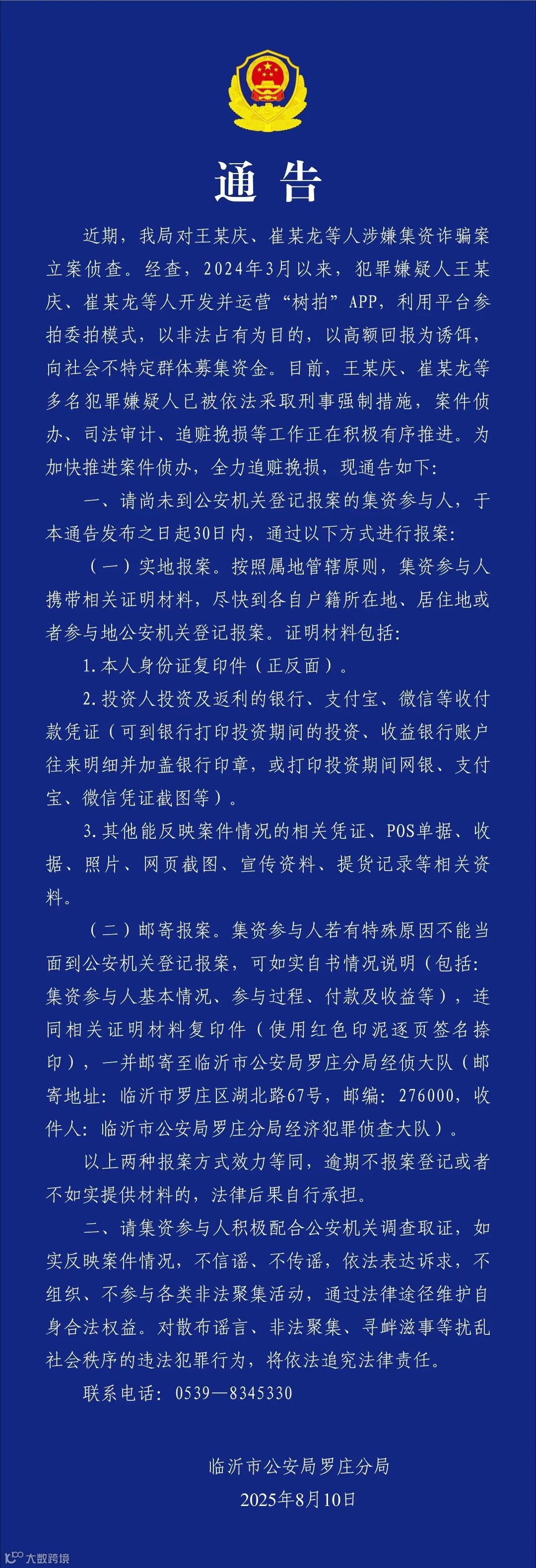 8月10日,山东临沂市公安局罗庄分局发布通告:近期,公安局对王某庆、崔某龙等人涉嫌集资诈骗案立案侦查。经查,2024年3月以来,犯罪嫌疑人王某庆、崔某龙等人开发并运营“树拍”APP,利用平台参拍委拍模式,以非法占有为目的,以高额回报为诱饵向社会不特定群体募集资金。
