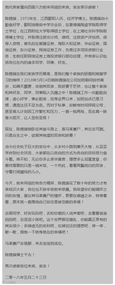 5月14日晚,网信证券上海投资银行部总经理陈锦旗加班期间猝然离世,令人扼腕叹惜。家属写给亲朋的一封感谢信,提醒奋力拼搏的人们在工作之余,也应驻足回望转身的幸福,更是发人深思。