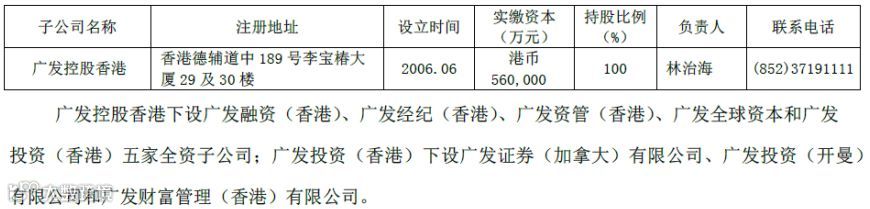 2006年,广发控股香港成立,广发控股香港下设广发融资(香港)、广发经纪(香港)、广发资管(香港)、广发全球资本和广发投资(香港)五家全资子公司;广发投资(香港)下设广发证券(加拿大)有限公司、广发投资(开曼)有限公司和广发财富管理(香港)有限公司。