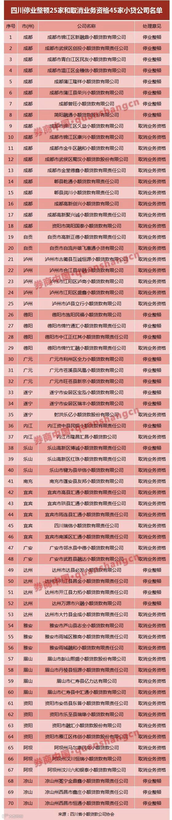 近日,四川省金融工作局及四川省小额贷款公司协会通报对该省小额贷款公司的合规经营检查结果,决定对25家小额贷款公司予以停业整顿,对45家小贷公司取消小贷业务资格。