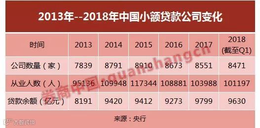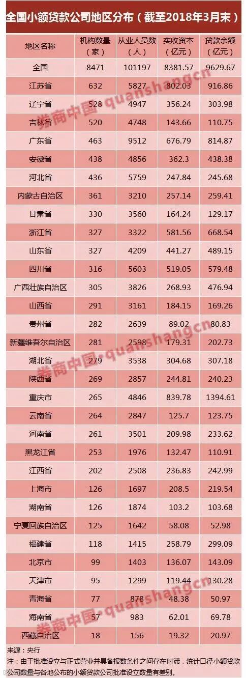 今年4月25日,央行官网发布2018年一季度小额贷款公司统计数据报告。截至2018年3月末,全国共有小额贷款公司8471家,贷款余额约9630亿元。