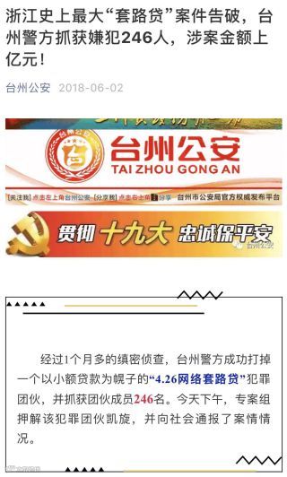 台州公安近日称,台州市警方成功端掉一起以“小额贷款”为幌子的网络套路贷犯罪团伙,并抓获团队成员246人。