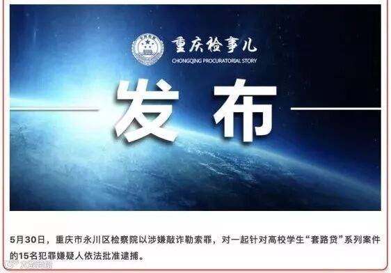 重庆市人民检察院5月30日发布消息称,重庆市永川区检察院以涉嫌敲诈勒索罪,对一起针对高校学生“套路贷”系列案件的15名犯罪嫌疑人依法批准逮捕。