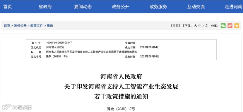 8月9日,据河南省人民政府网站消息,河南省人民政府印发《河南省支持人工智能产业生态发展若干政策措施》(以下简称《若干政策措施》),其中提出了十条具体举措推动人工智能科技创新与产业创新深度融合。