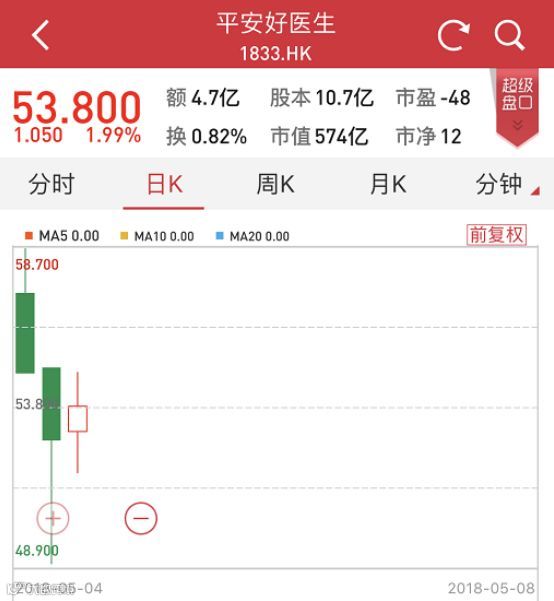 5月4日,作为成为互联网医疗第一股,平安好医生以 57.30港元开盘,较发行价上涨4.6%。但平安好医生上市后第二个交易日开盘后直线跌破发行价54.80港元。今日(5月8日)依然以破发价53港元开盘后,股价一直小幅震荡,截至8日收盘,报收53.8港元,涨幅1.99%。