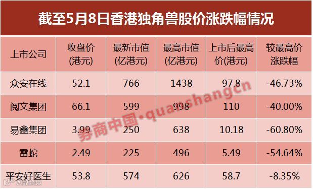 截至今日(5月8日),众安在线、阅文集团、易鑫集团、雷蛇股价较上市最高股价跌幅均超四成,其中易鑫集团股价暴跌约61%。从市值方面来看,五家新经济公司市值距离此前高位已累计跌去1782亿港元,约人民币1400亿元。
