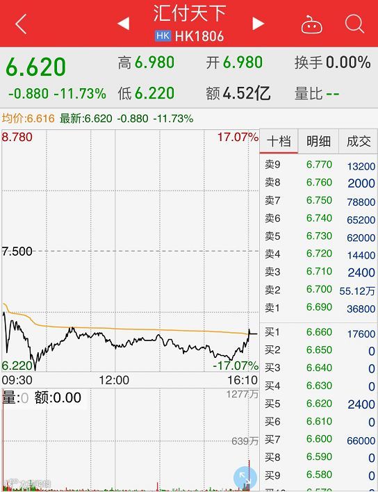 另一方面是股价,汇付天下首日挂牌即破发,开盘报6.98港元,较招股价7.5港元跌了近7%,盘中,股价一度跌幅达17%,截至收盘,股票报价6.62港元,下跌11.73%。