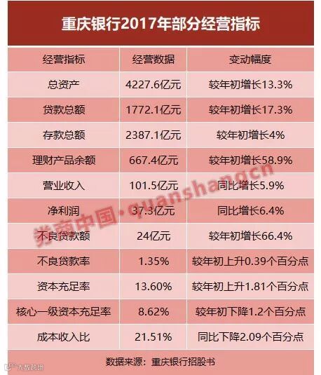 重庆银行招股书显示,该行2017年实现营业收入101.45亿元,同比增长5.9%;全年实现归属于股东的净利润增长6.39%至37.26亿元。