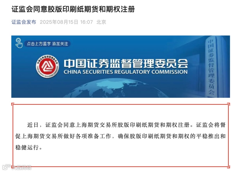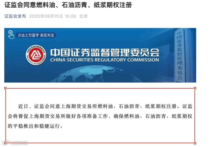 近日,中国证监会同意上海期货交易所(下称“上期所”)胶版印刷纸期货、燃料油、石油沥青和纸浆期权注册,标志着上期所即将上市全球首个文化用纸金融衍生品,同时加速实现成熟期货品种期权覆盖,上期所产品体系进一步丰富。