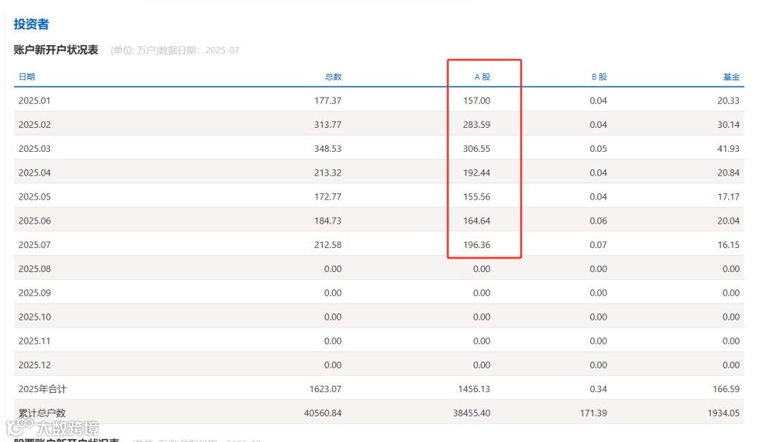 就整体来看,截至今年前7个月,A股合计新开户数达到1456.13万户,较2024年前7月A股合计新开户数1063.79万户增长36.88%。