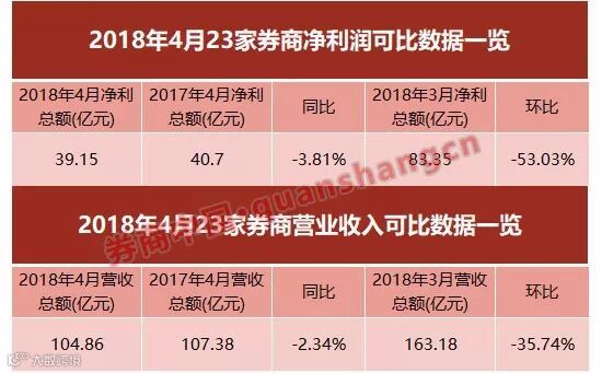 截至5月7日晚间,26家上市券商发布了2018年4月财务数据。剔除缺少可比数据的3家新上市券商后,23家券商4月份共实现营收104.86亿元,同比下降2.34%,环比下降35.74%;净利润39.15亿元,同比下降3.81%,环比下降53.03%。