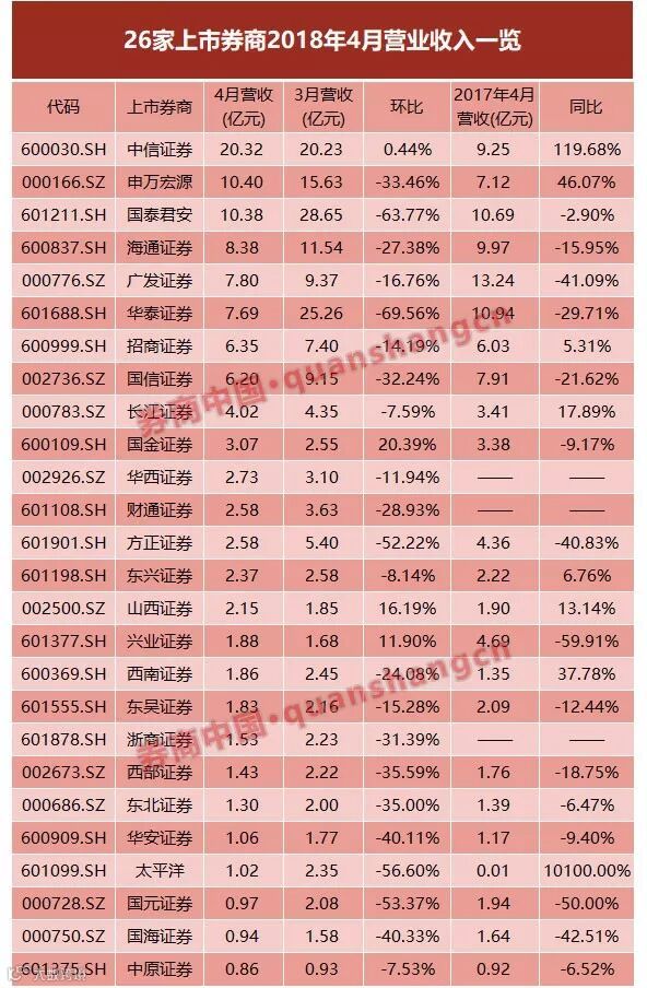 同比情况整体略好于环比数据,剔除缺少可比数据的3家券商后,23家券商中,8家营业收入同比增长,分别是,太平洋、中信证券、申万宏源、西南证券、长江证券、山西证券、东兴证券、招商证券。其中,太平洋证券因为去年同期基数较小,同比增幅高达10100%;太平洋证券2017年4月营业收入仅为0.01亿元,今年则为1.02亿元,今年较去年4月份增长了1.01亿元。