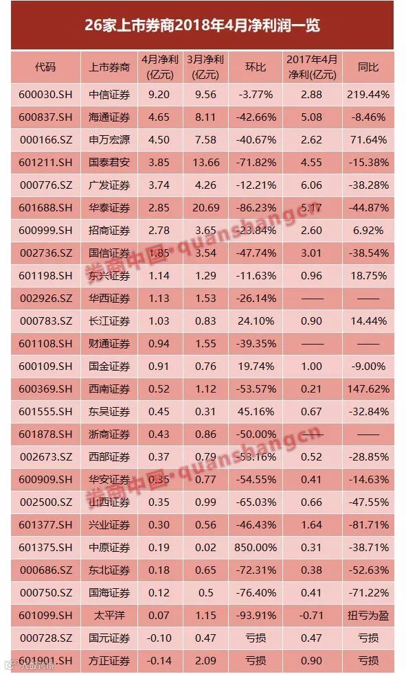 4月份,单月净利润前五的上市券商分别是:中信证券(9.2亿元)、海通证券(4.65亿元)、申万宏源(4.5亿元)、国泰君安(3.85亿元)、广发证券(3.74亿元);国元证券、方正证券两家出现亏损,分别亏0.1亿元和0.14亿元。