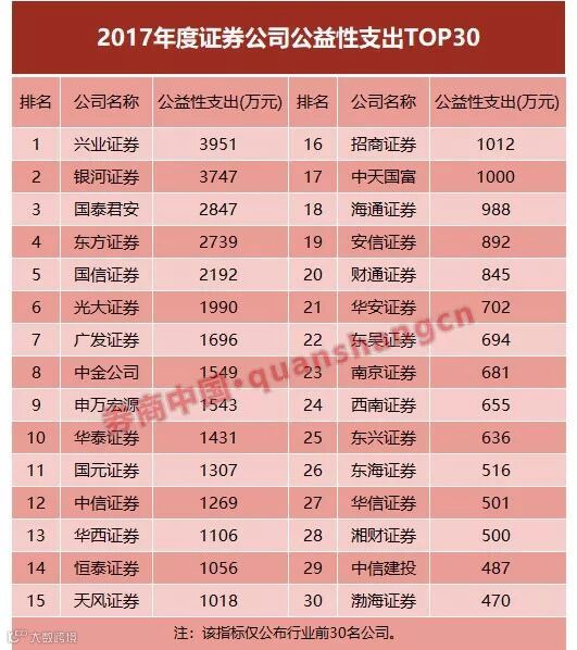 “2017年度证券公司公益性支出”这一指标仅公布行业前30名券商,去年30家券商公益性支出总额约4亿元。