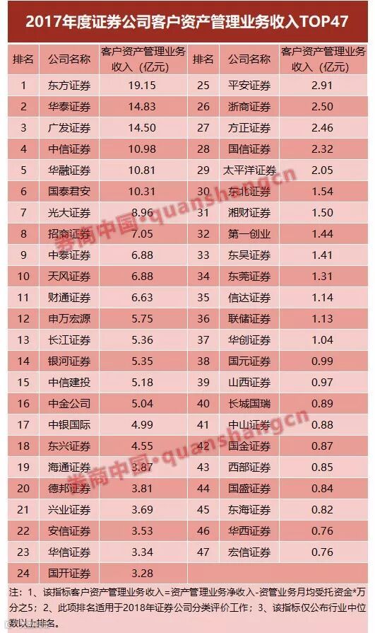 8. 东方证券去年客户资产管理业务收入19.15亿元,位居行业第一。紧随其后的是华泰证券和广发证券,收入分别为14.83亿元、14.5亿元,位列第二、第三。中信证券、华融证券和国泰君安去年客户资产管理业务收入也超过10亿元。