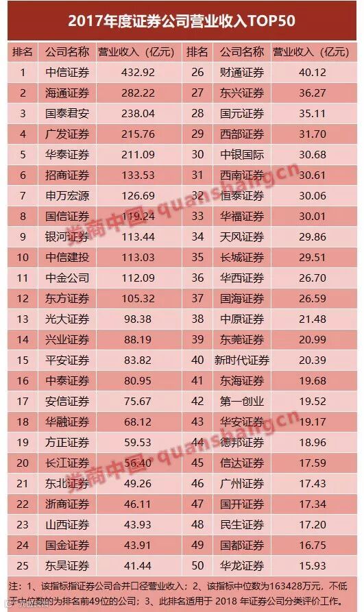 2017年,证券公司实现营业收入3113.28亿元,同比下降5.08%。前十券商去年实现营业收入合计1985.94亿元,占去年全行业营收比重64%。排名前十券商分别是中信证券、海通证券、国泰君安、广发证券、华泰证券、招商证券、申万宏源、国信证券、中国银河和中信建投证券。