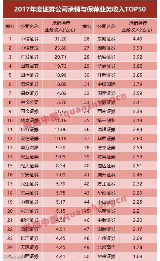 9.中信证券和中信建投证券去年投行业务收入分别为39.88亿元、32.46亿元,稳居行业前两位。广发证券、国泰君安、国信证券、海通证券去年收入均超过20亿元。