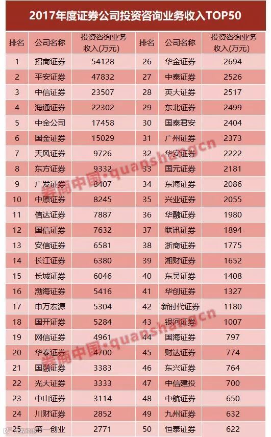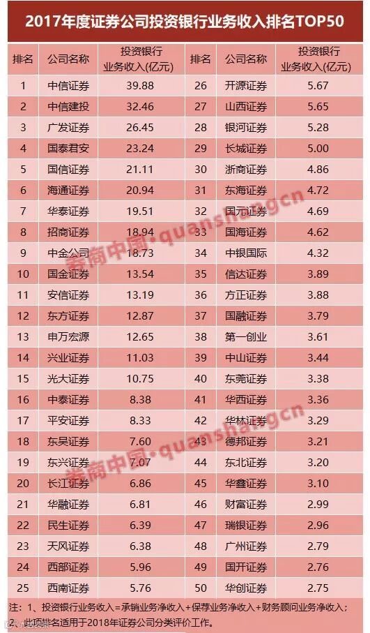这一指标是券商承销业务净收入、保荐业务净收入、财务顾问业务净收入总和,排名适用于2018年证券公司分类评价。