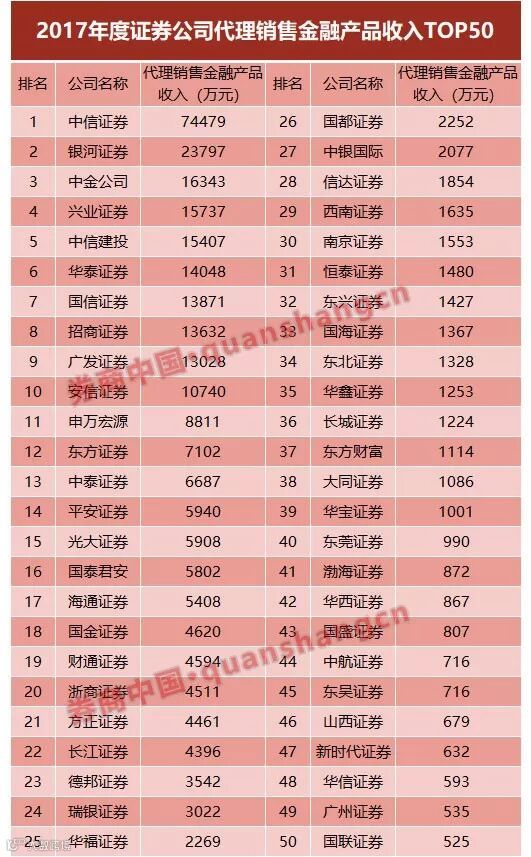 中信证券去年代理销售金融产品收入7.45亿元,位居行业第一。排名第二的是中国银河,去年代理销售金融产品收入2.38亿元;中金公司位居第三,去年代理销售金融产品收入1.63亿元。