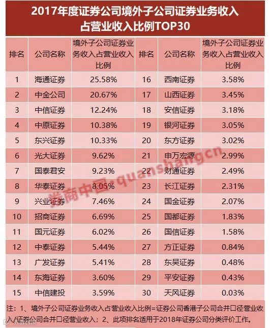 去年,仅海通证券和中金公司境外子公司证券业务收入占营业收入比例超过20%,稳居行业前两位。
