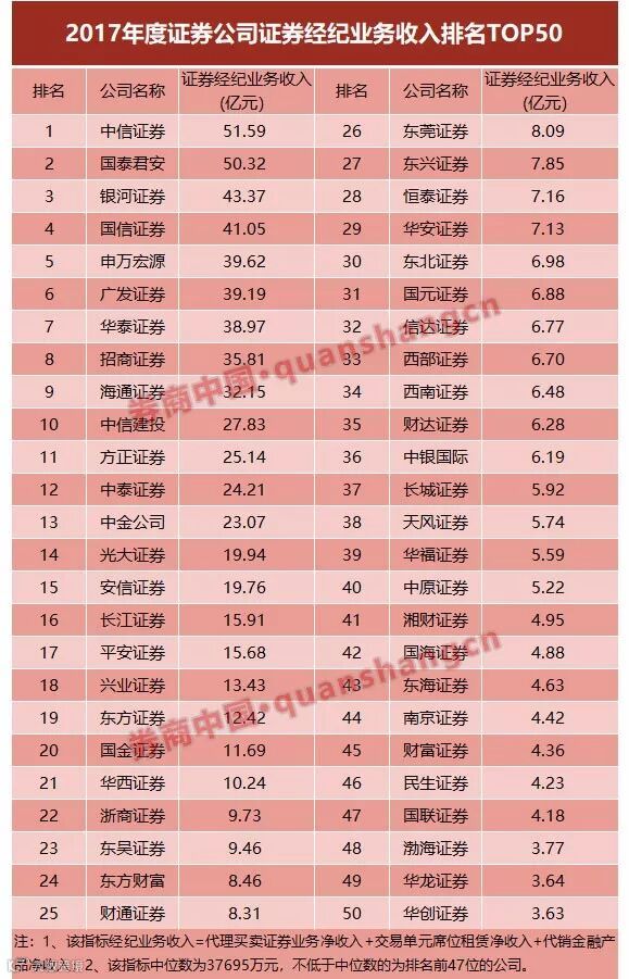 7. 中信证券去年证券经纪业务收入51.59亿元,位居行业榜首。国泰君安50.32亿紧随其后。这一指标是券商代理买卖证券业务净收入、交易单元席位租赁净收入、代销金融产品净收入的总和。