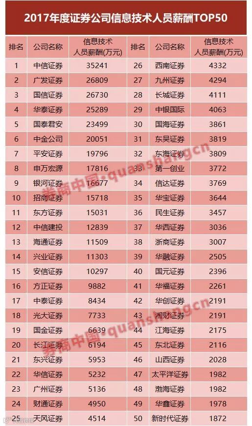 证券公司信息技术人员薪酬排名显示,中信证券去年的信息技术人员薪酬处于全行业最多,达3.52亿元。广发证券、国信证券、华泰证券、国泰君安、中金公司去年的信息技术人员薪酬均超过2亿元。