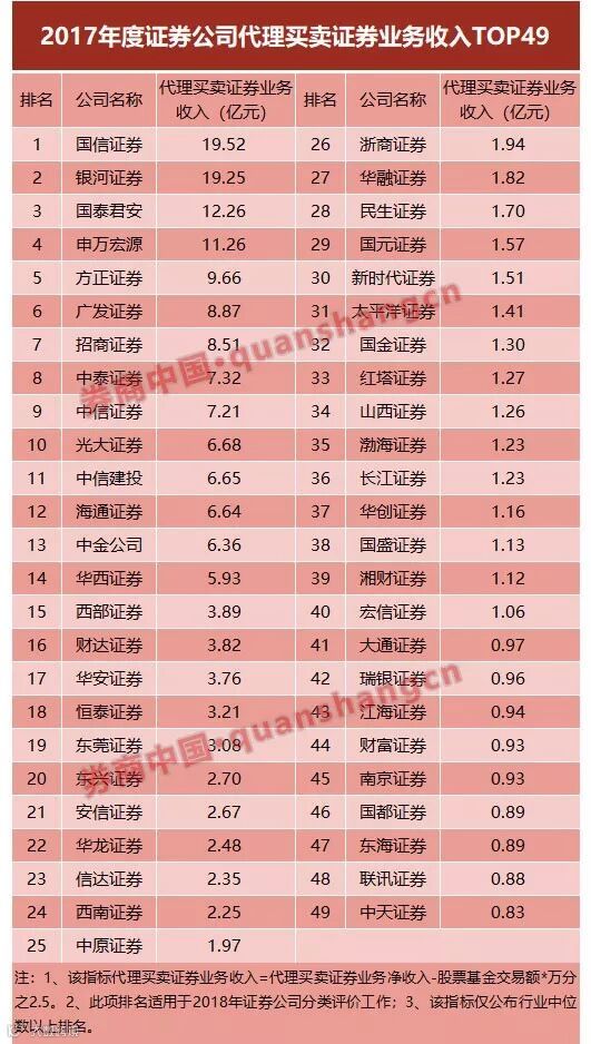 其中,国信证券去年代理买卖证券业务收入跃居全行业第一,达19.52亿元。中国银河证券紧随其后,去年代理买卖证券业收入19.25亿元,国泰君安证券和申万宏源位列第三、第四。该指标仅公布行业中位数以上排名,共有49家券商上榜,华泰证券、东方财富证券、兴业证券等券商均不在榜单中。