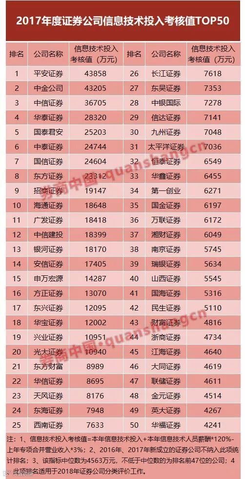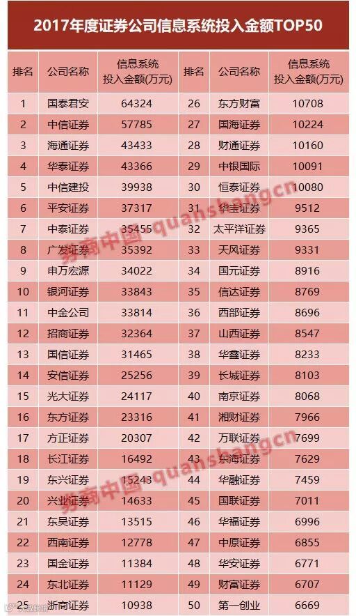 “证券公司信息系统投入金额”指标排名首次公开,国泰君安以去年信息系统投入金额6.43亿元位居行业榜首,中信证券位居第二,去年信息系投入金额5.78亿元。