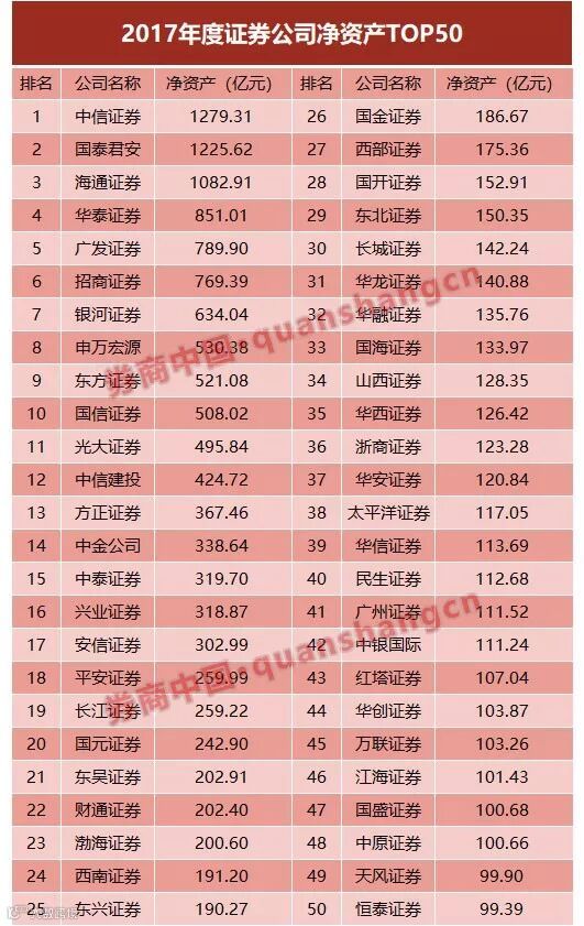 截至去年末,也有18家券商总资产低于100亿元,东亚前海证券、网信证券、汇丰前海证券、华菁证券、瑞银证券和北京高华证券总资产不及50亿。