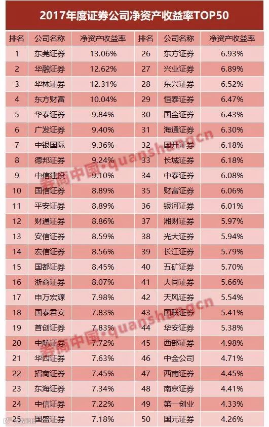 华泰证券去年资产收益率9.84%,行业排名由2016年度的第44名上升至第5名;东方财富为10.04%,排名由第19名上升至第4名;中银国际证券9.36%,排名由第25名上升至第7名。