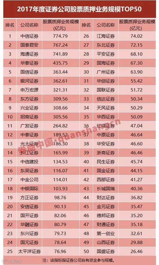 证券业协会统计,截至去年底,88家券商去年自有资金参与股票质押业务规模累计8193.87亿元。其中,中信证券去年股票质押业务规模774.79亿元,位居榜首;紧随其后的是国泰君安和海通证券,去年股票质押业务规模分别是767.24亿元、741.89亿元。