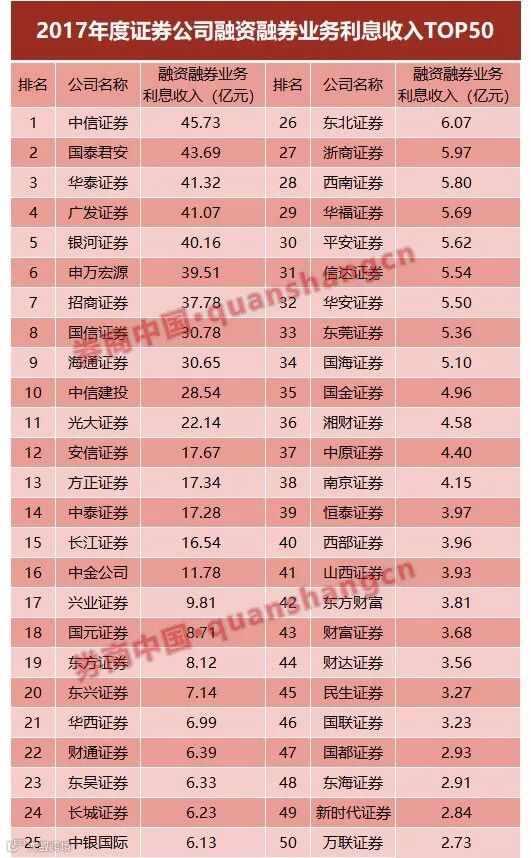 去年全年,中信证券融资融券业务利息收入达45.73亿元,位居行业第一;国泰君安、华泰证券、广发证券、中国银河也均超过40亿元。