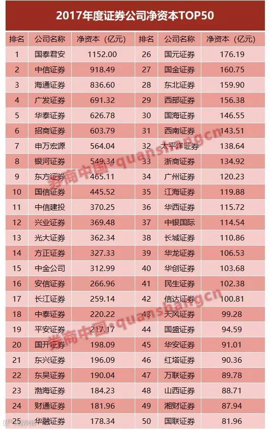 去年末,国泰君安净资本1152亿元,位居行业榜首;中信证券918.49亿元,位列行业第二。海通证券净资836.6亿元,位列行业第三。广发证券、华泰证券、招商证券、申万宏源、银河证券等券商净资本也超过500亿元。