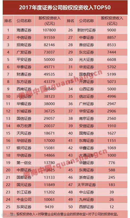 去年全年,50家券商股权投资收入98.02亿元。其中,海通证券去年收入10.78亿元,位居行业第一;中信证券收入9.16亿元,位列第二;招商证券和广发证券位列第三、第四,平安证券去年股权投资收入5亿元,跃居第五。