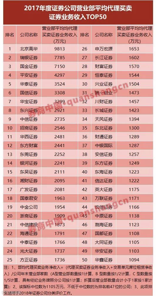 2017年度证券公司营业部平均代理买卖证券业务收入排名显示,共有17家券商超过2000万元。该指标中位数为1105万元,不低于中位数的为排名前47位的券商。