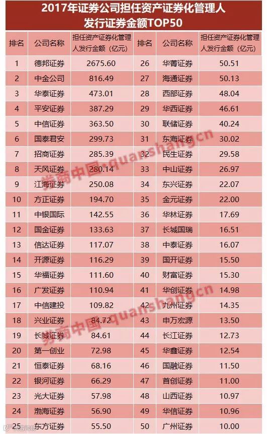 其中,德邦证券担任资产证券化管理人发行证券金额2675.6亿元,排名位居行业第一;中金公司816.49亿元,位居行业第二;华泰证券位居行业第三,去年ABS发行金额473.01亿元。