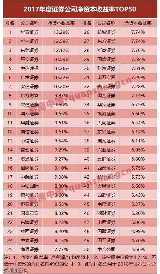 按照“证券公司净资本收益率位于行业前5名、前10名、中位数以上的,分别加2分、1分、0.5分”规则,华泰证券、华林证券、东莞证券、平安证券、中信建投今年分类评级因此项各加2分。