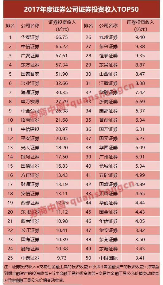 共有24家券商去年证券投资收入超过10亿元。其中,华泰证券去年证券投资收入达66.75亿元,位居行业第一;中信证券紧随其后,去年证券投资收入65.22亿元,行业排名第二;广发证券、东方证券和国泰君安去年证券投资收入也超过50亿元。