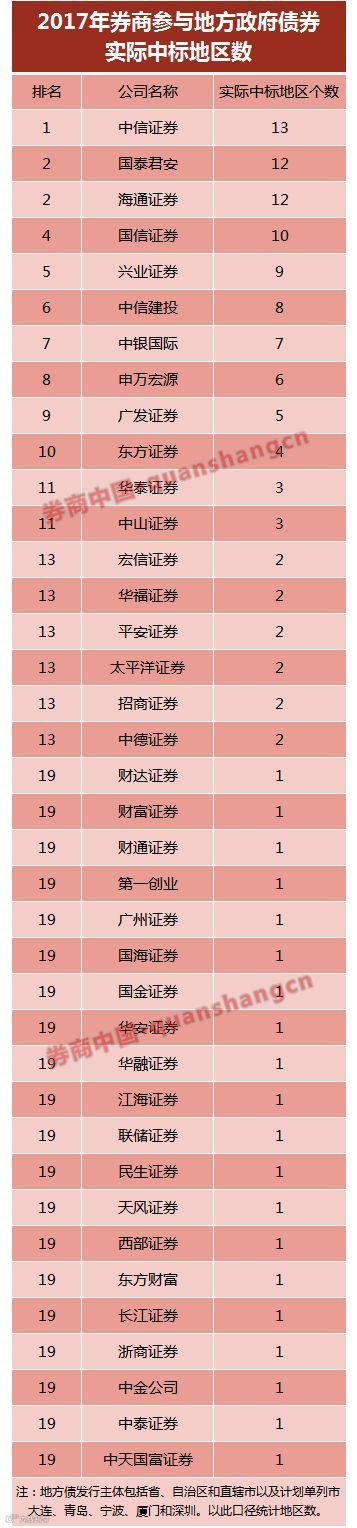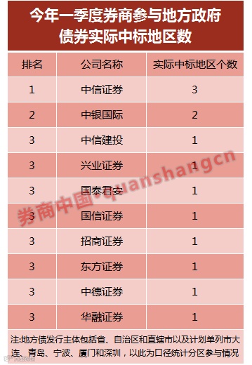 中信证券位居“今年度一季度券商参与地方政府债券实际中标金额”和“今年一季度券商参与地方政府债券实际中标地区数”两大榜单第一。今年一季度,中信证券承销交易所地方债实际金额12.6亿元,实际中标地区是3个。