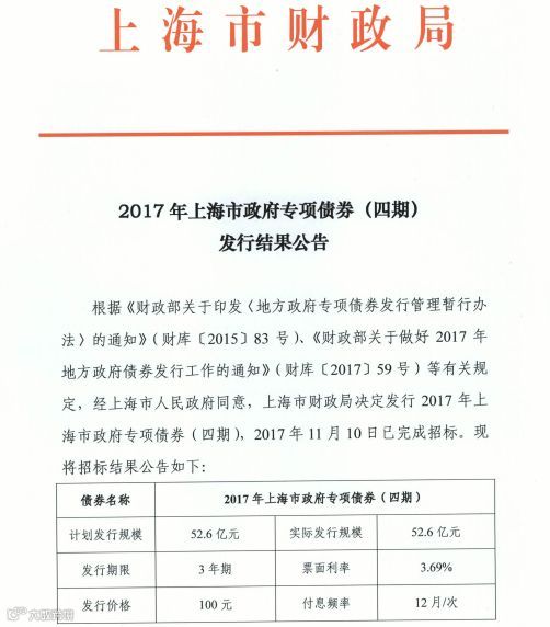 上海市政府在交易所发行地方债的债券品种为记账式固定利率附息债,总规模100亿元,分为专项债券和土地储备专项债券,期限3年期,发行利率3.69%。上海市财政局履行相关程序,增补中信证券、国泰君安证券、招商证券、中信建投证券、广发证券5家券商类金融机构为政府债券承销团一般成员。