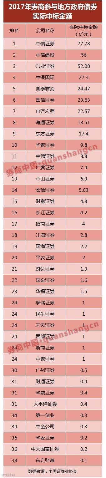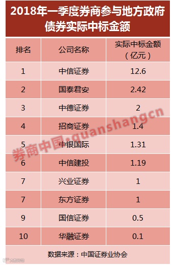 中信证券位居榜首,今年一季度交易所地方债实际中标金额12.6亿元;国泰君安证券和中德证券今年一季度交易所地方政府债券实际中标金额均超过2亿元,分别位居行业第二、第三。