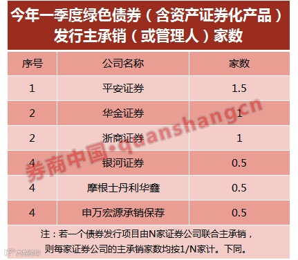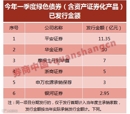 此外,2018年一季度,平安证券、华金证券、浙商证券、中国银河证券、摩根士丹利华鑫证券及申万宏源承销保荐等6家券商作为绿色债券主承销商或绿色资产证券化产品管理人(沪深交易所市场)共承销发行5只产品,合计金额39.3亿元。具体情况如下: