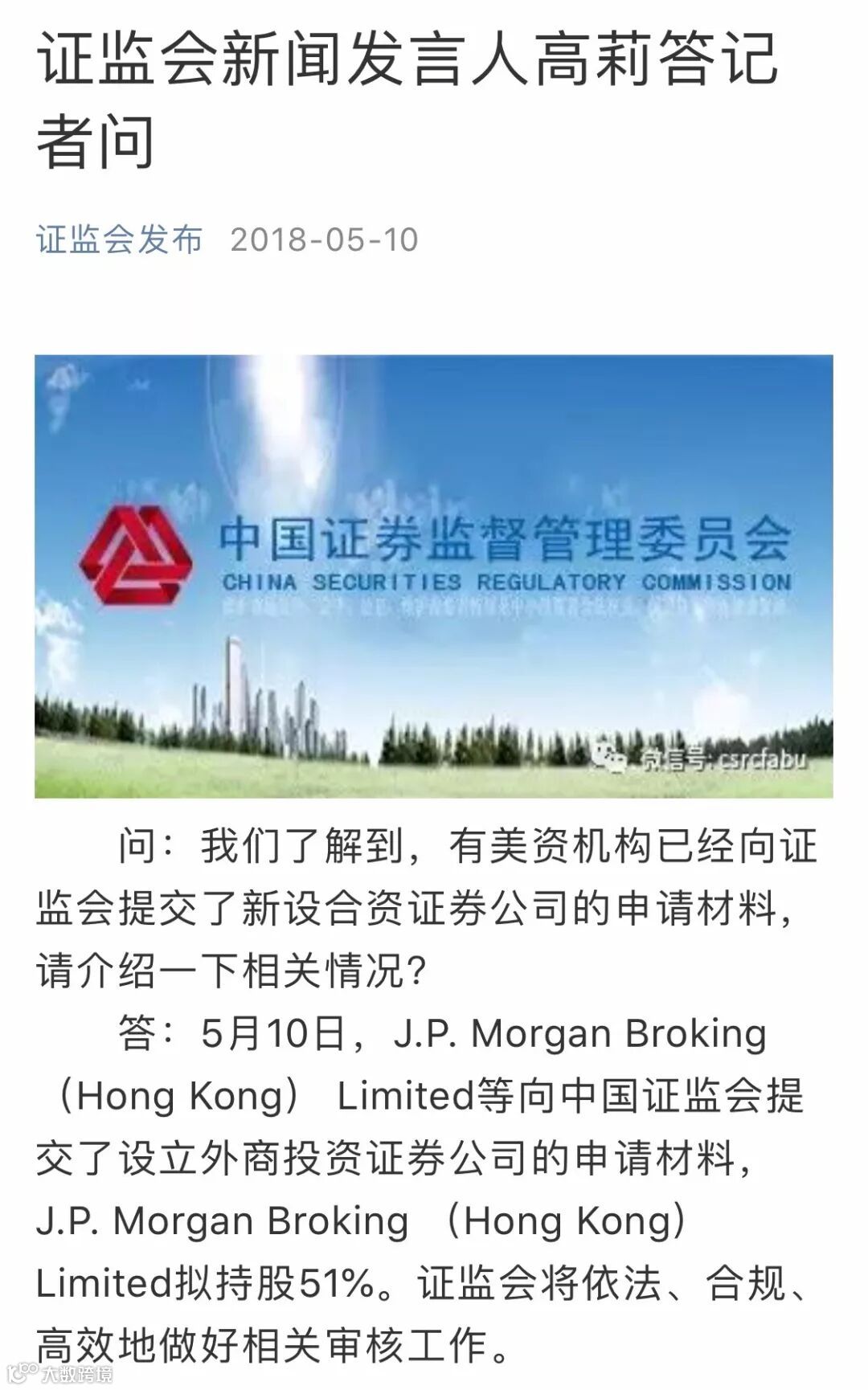 J.P. Morgan Broking (Hong Kong) Limited(摩根大通)今日向中国证监会提交了设立外商投资证券公司的申请材料,J.P. Morgan Broking (Hong Kong) Limited拟持股51%。证监会新闻发言人高莉表示,证监会将依法、合规、高效地做好相关审核工作。