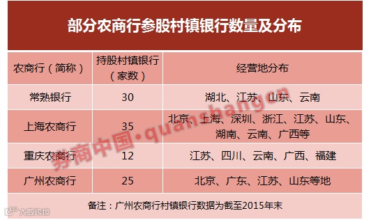 除了上述的上海农商行、重庆农商行,还有常熟银行持有30家村镇银行股权,广州农商行参股25家村镇银行,网点地址多遍布在该农商行所处省份之外。