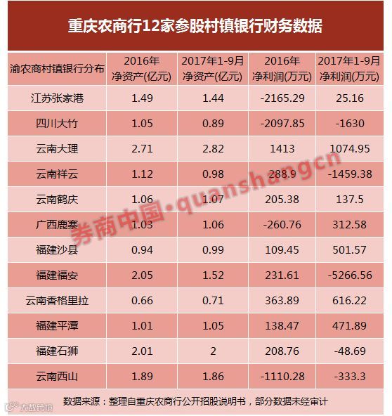 重庆农商行最新披露的招股说明书(申报稿)显示,控股的12家村镇银行中,截至2016年末,有4家亏损,其中三家亏损金额超过1000万元;而到了2017年9月,虽然之前大幅亏损的村镇银行盈利状况明显好转,但亏损家数仍扩大到了5家,其中三家由净赚到净亏,而福建福安渝农商村镇银行甚至由2016年净赚200多万到巨额亏损近5270万元。